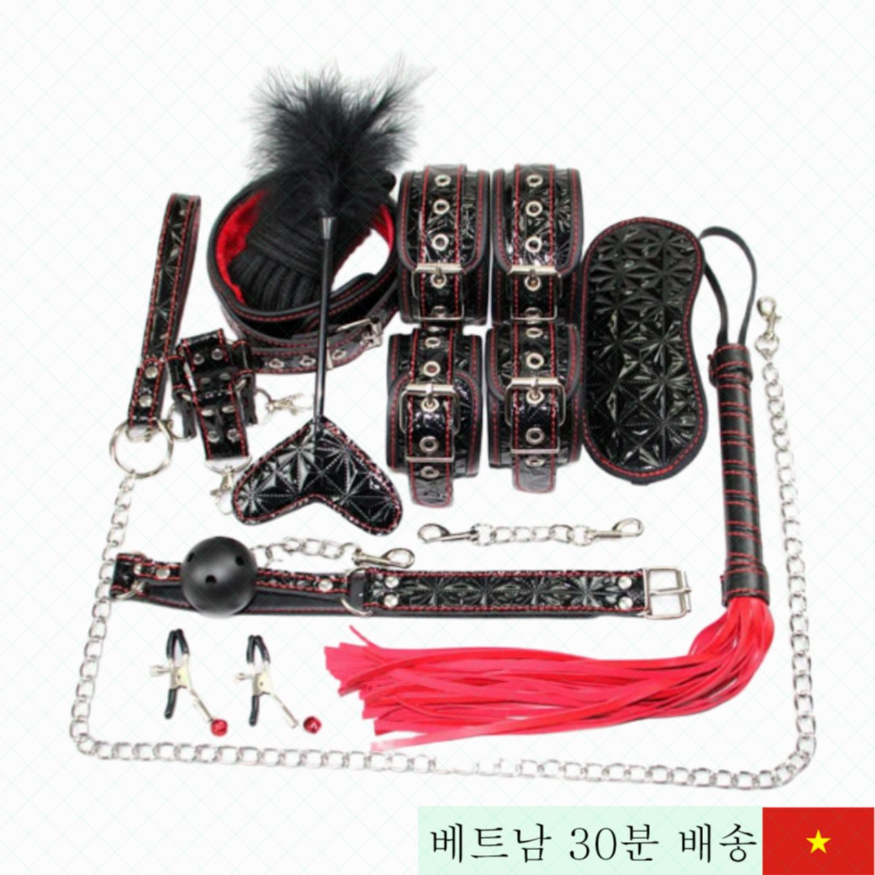 10가지 구성품은 손목·발목 수갑, 눈가리개, 목걸이, 가죽 채찍, 풍만한 엉덩이 때리개, 입마개, 각종 스트랩과 십자형 잠금장치, 유두 클립 등 다양합니다. 하나하나 정교하게 설계되어 사용자 취향에 맞는 플레이가 가능합니다.