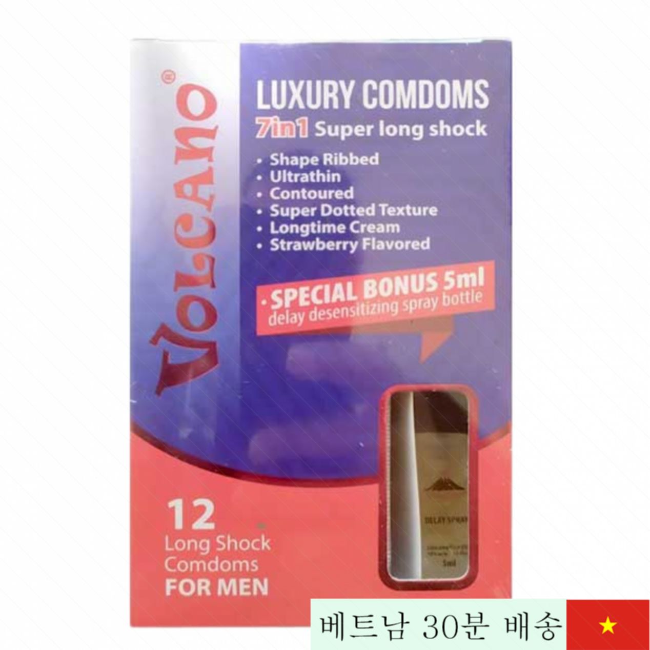 Volcano 7in1은 7가지 기능이 결합된 혁신적인 콘돔입니다. 52mm의 표준 사이즈로 편안한 착용감을 주며, 자연 고무 100% 소재로 피부에 자극 없이 안전합니다. 각 제품은 12개가 한 세트로 구성되어 있으며, 함께 제공되는 5ml 지연 스프레이가 조기 사정을 효과적으로 방지해 줍니다.